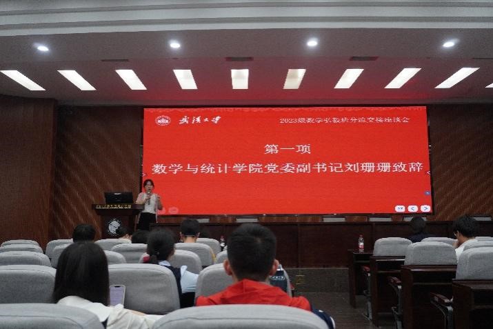 刘珊珊对2023级数学弘毅班的到来表示热烈欢迎,对弘毅学堂一年来对同学们的悉心培养表示感谢。她介绍了学院建设发展和拔尖人才培养情况,她希望同学们尽快适应新的学习环境,坚持数学梦想、潜心学习科研,利用好学校、学院为弘毅班提供的平台,提升个人能力和综合素养。她相信,在师生共同努力下,同学们一定能在学院收获全方位成长。