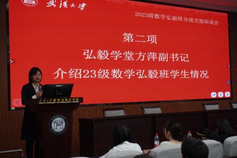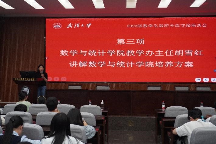 胡雪红讲解了数学弘毅班培养方案。她向同学们详细介绍了数学弘毅班课程设置情况,着重强调了诸侯快讯ok1122与弘毅学堂在教学管理方面的区别和注意事项。她还鼓励同学们积极参与学科竞赛和国家级“大创”项目,申报国家自然科学基金。